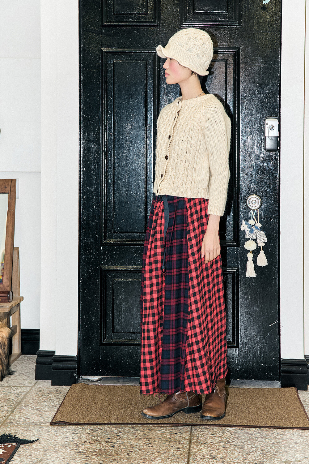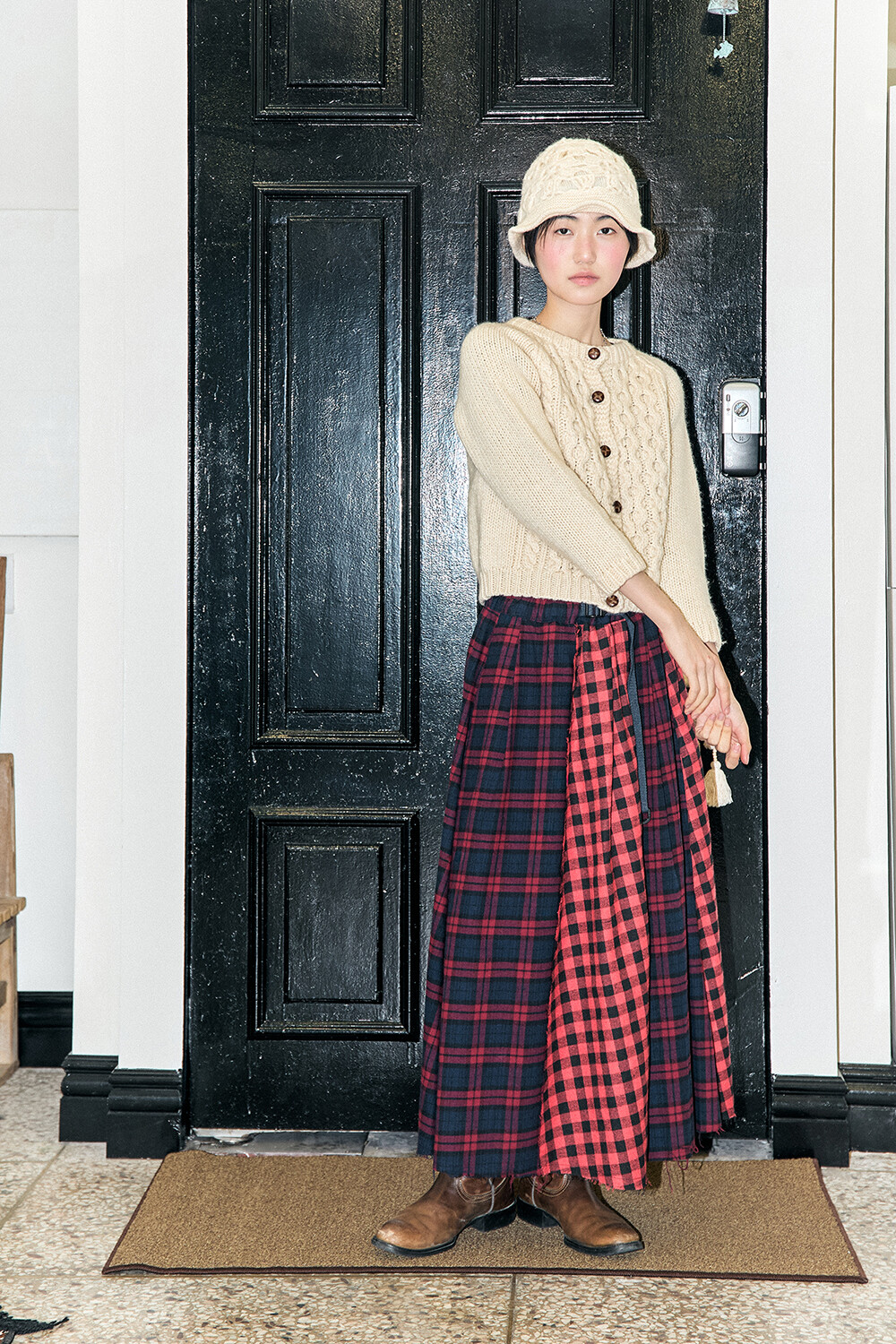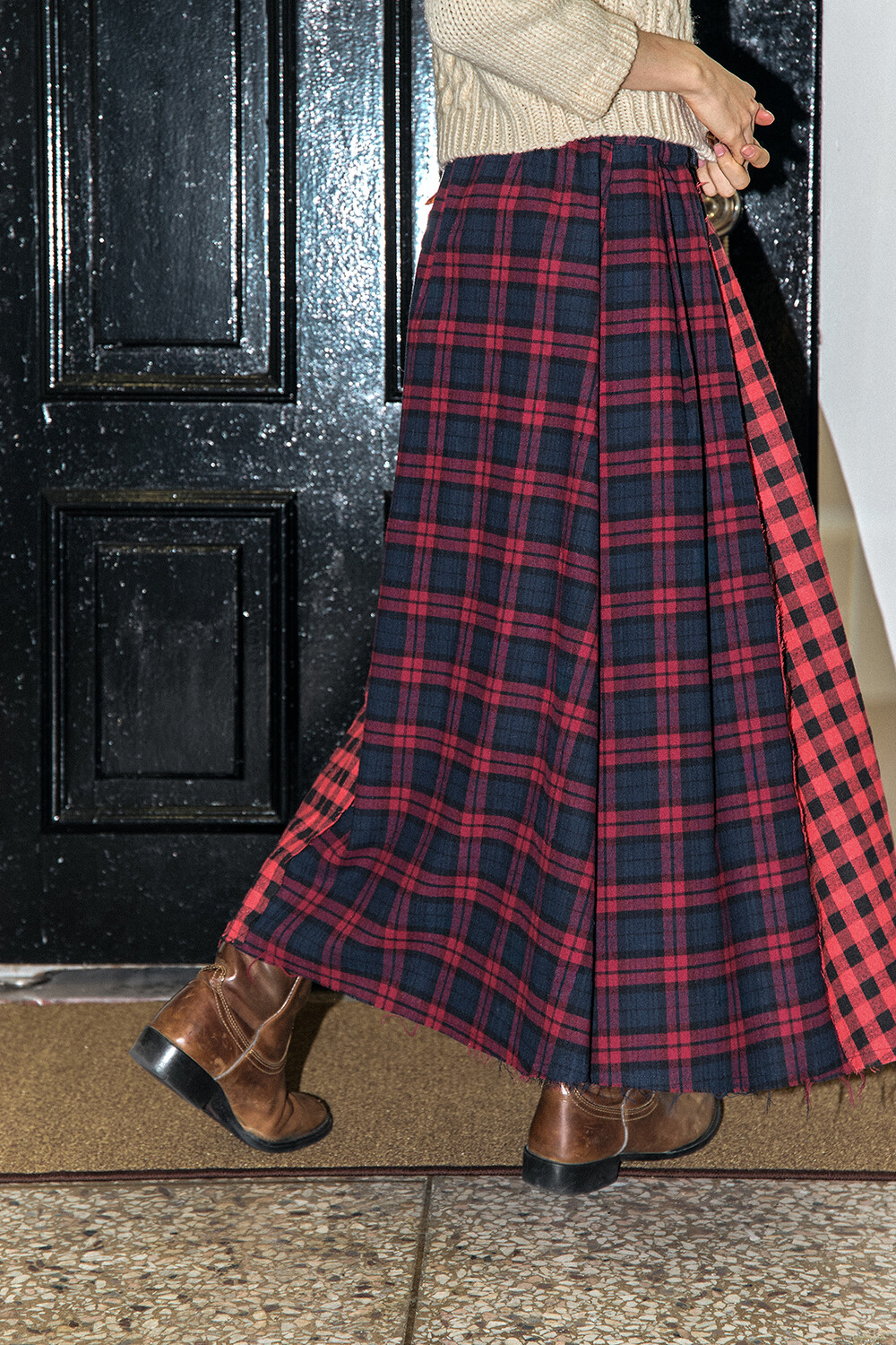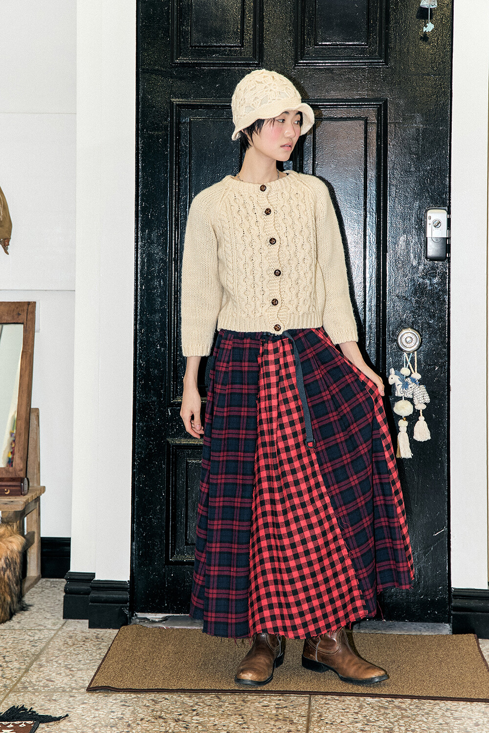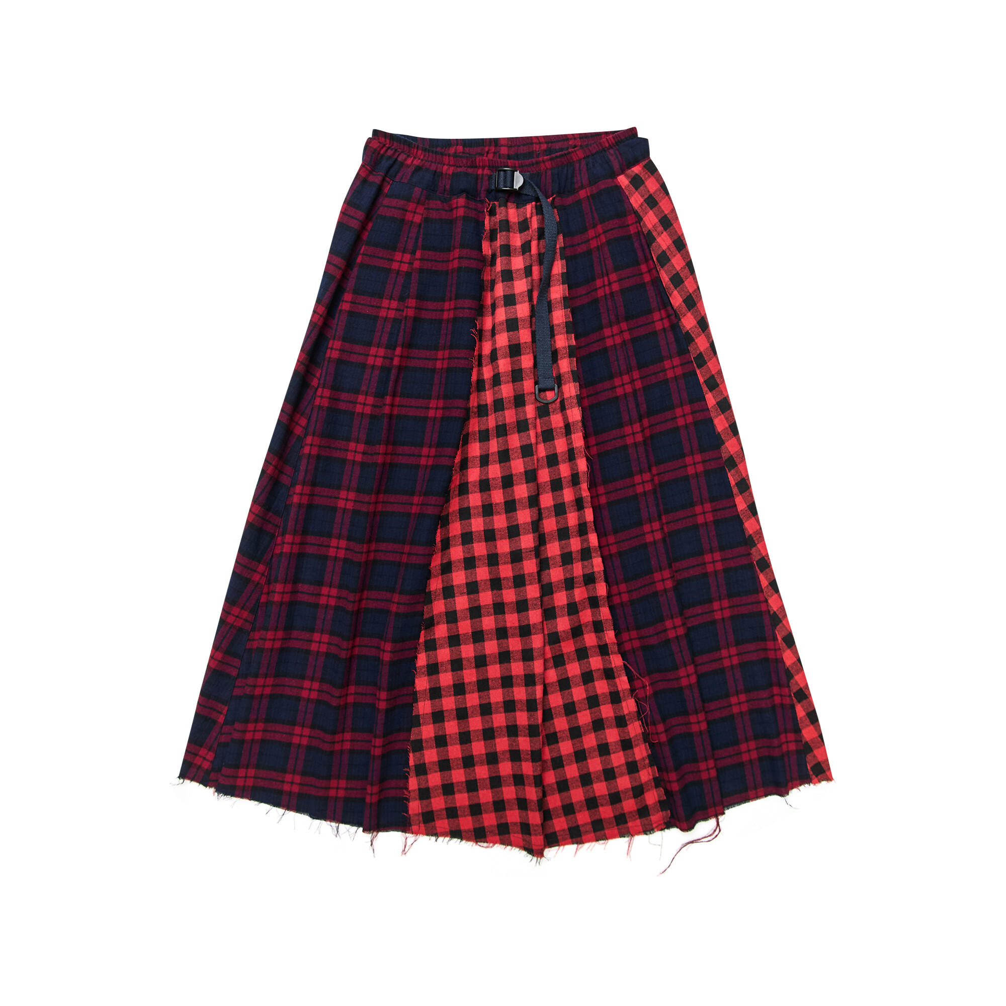 • BRAND: GORT®(고트) • PRODUCT NAME: CHECK PATCHWORK BUCKLE CIRCLE SKIRT-RD • CODE: G73301_RD *MADE IN KOREA