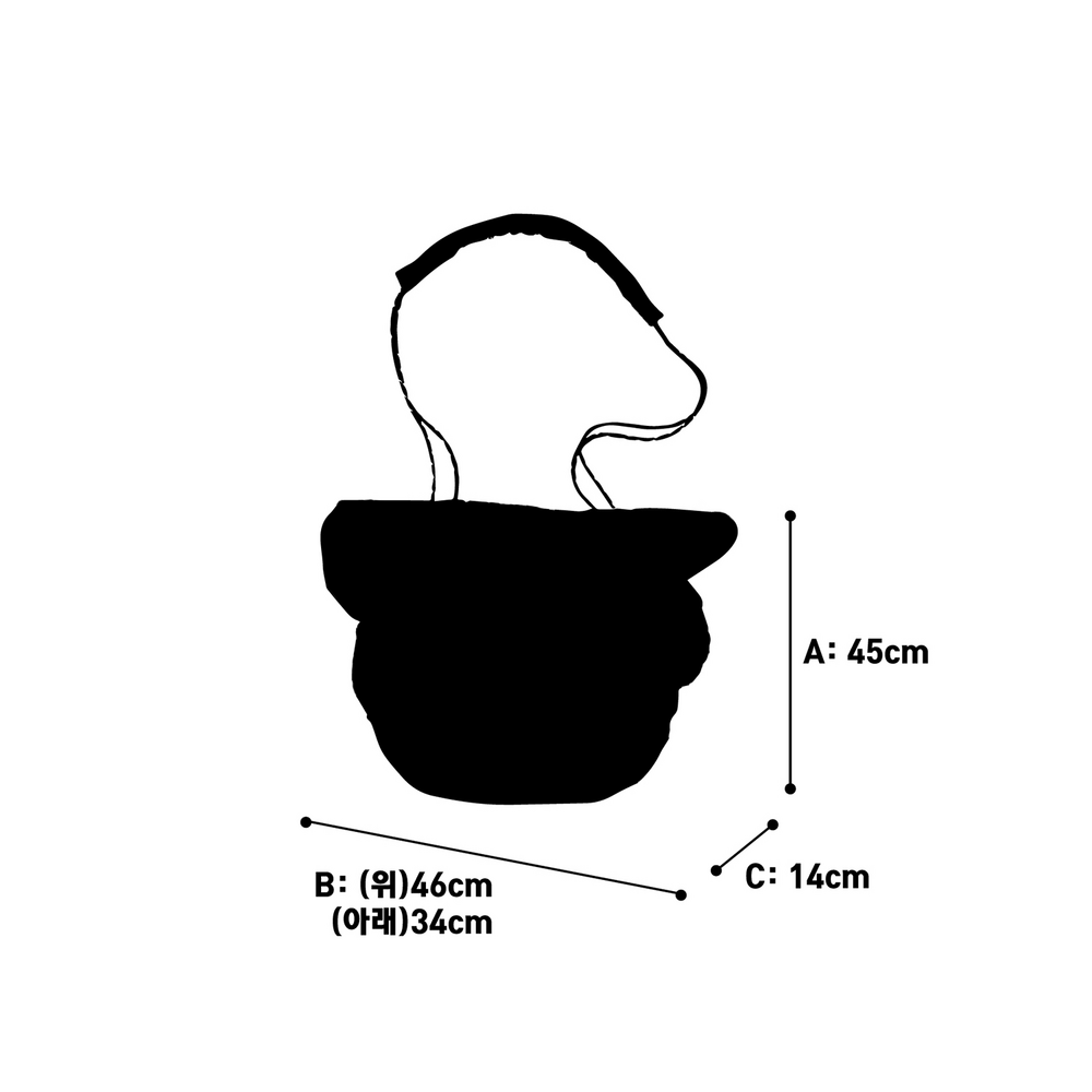 • MEASUREMENT: W/M ONE SIZE A. HEIGHT(높이): 45cm(끈 길이 제외) B. WIDTH(가로): (위)46cm, (아래)34cm C. LENGTH(세로): 14cm *사이즈 치수는 측정 방법과 위치에 따라 약간의 오차가 발생할 수 있습니다.
